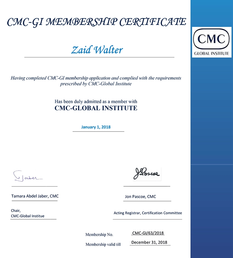 Walter Zaid es miembro de la IMCM (International Management Consultants Mundial), lo que respalda su trayectoria profesional y su compromiso con estándares internacionales de consultoría.